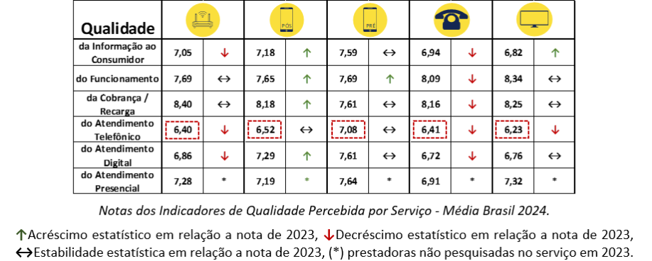 As notas nacionais por serviço para cada Indicador de Qualidade Percebida seguem abaixo: